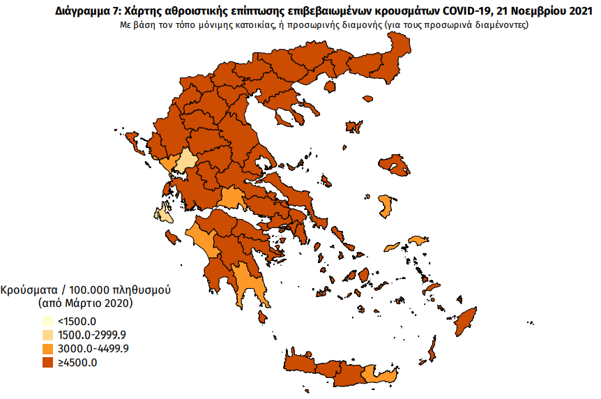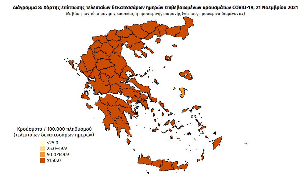 Ο χάρτης αποτυπώνει τη γεωγραφική κατανομή των συνολικών κρουσμάτων COVID-19 (από την αρχή της επιδημίας) ανά Περιφερειακή Ενότητα της χώρας, με βάση την δηλωθείσα διεύθυνση μόνιμης κατοικίας του ασθενούς, ή τη διεύθυνση προσωρινής διαμονής για τους τουρίστες και άλλους προσωρινά διαμένοντες στην Ελλάδα. Συμπεριλαμβάνονται τόσο κρούσματα με ιστορικό ταξιδίου (“εισαγόμενα”) όσο και κρούσματα με πιθανή εγχώρια μετάδοση.