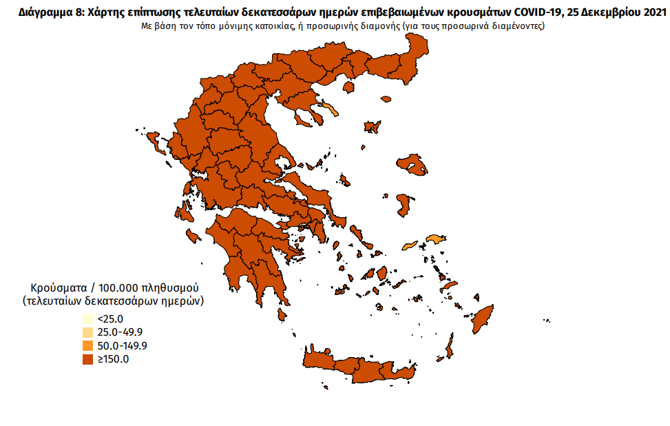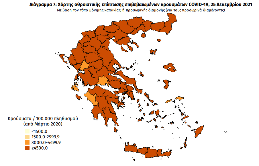 Ο χάρτης αποτυπώνει τη γεωγραφική κατανομή των συνολικών κρουσμάτων COVID-19 (από την αρχή της επιδημίας) ανά Περιφερειακή Ενότητα της χώρας, με βάση την δηλωθείσα διεύθυνση μόνιμης κατοικίας του ασθενούς, ή τη διεύθυνση προσωρινής διαμονής για τους τουρίστες και άλλους προσωρινά διαμένοντες στην Ελλάδα. Συμπεριλαμβάνονται τόσο κρούσματα με ιστορικό ταξιδίου (“εισαγόμενα”) όσο και κρούσματα με πιθανή εγχώρια μετάδοση.