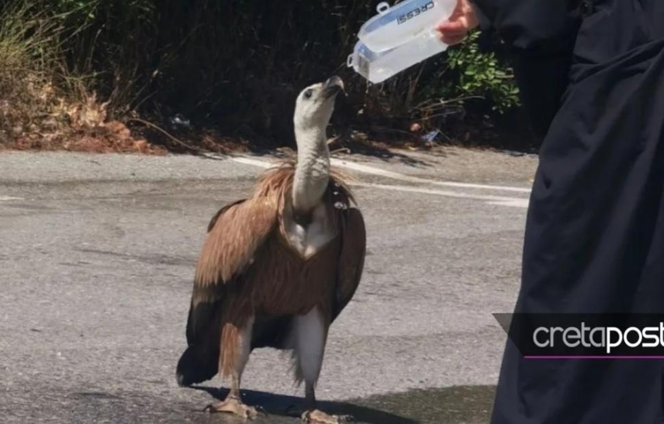 «Θύμα» της έντονης ζέστης, ένα όρνιο πίνει νερό που του προσφέρει ο ιερέας από τον Ιερό Ναό Αγίου Γεωργίου στο Σεληνάρι, ενώ το άγριο πτηνό έχει προσγειωθεί στη μέση της εθνικής οδού Ηρακλείου Αγίου Νικολάου.