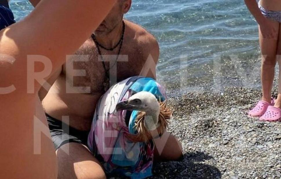 Σύμφωνα με το cretalive.gr, ο γύπας εντοπίστηκε μέσα στη θάλασσα, και δεν μπορούσε να πετάξει. Λουόμενοι τον παρακολουθούσαν από το Σάββατο, και διαπίστωσαν πως δυσκολευόταν. Σήμερα Κυριακή, (24/07), κάποιοι πήγαν στο ίδιο μέρος για να τον βρουν, και έσπευσαν να τον βοηθήσουν.