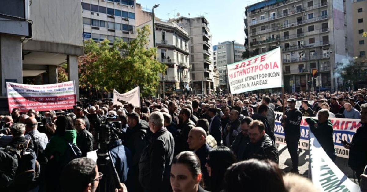Οι αγρότες και οι κτηνοτρόφοι πραγματοποίησαν προσυγκέντρωση στην πλατεία Καραϊσκάκη και στη συνέχεια πραγματοποιούν πορεία προς το υπουργείο Αγροτικής Ανάπτυξης και τον ΟΠΕΚΕΠΕ.