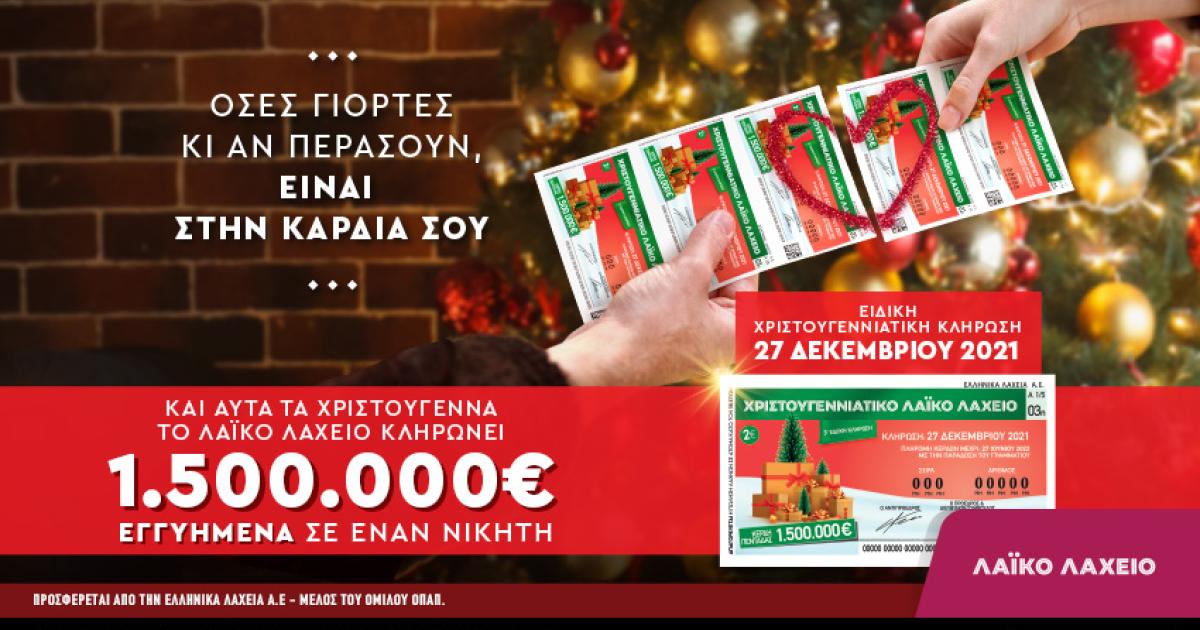 Αντίστροφα μετρά ο χρόνος για τη χριστουγεννιάτικη κλήρωση του Λαϊκού Λαχείου, η οποία θα αναδείξει έναν μεγάλο νικητή που θα κερδίσει εγγυημένα 1,5 εκατ. ευρώ, αλλά και πολλούς άλλους τυχερούς με μικρότερα κέρδη.
