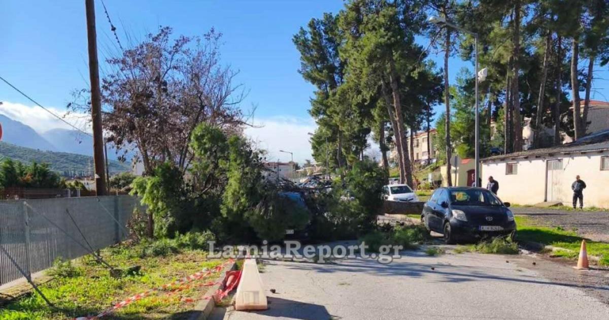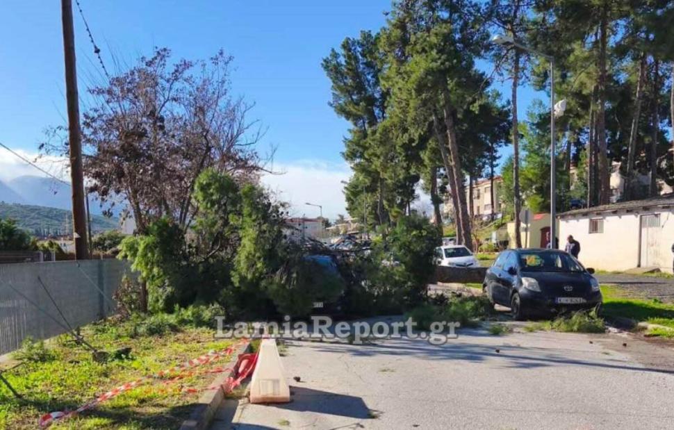 Εξαιτίας των ισχυρών ανέμων, ένα μεγάλο πεύκο που βρισκόταν στη νότια πλευρά του περιβάλλοντα χώρου του νοσοκομείου Λαμίας, έπεσε σε παρκαρισμένα αυτοκίνητα, προκαλώντας υλικές ζημιές, σύμφωνα με το lamiareport.gr.