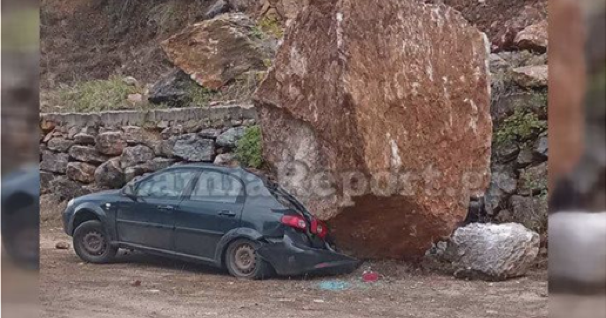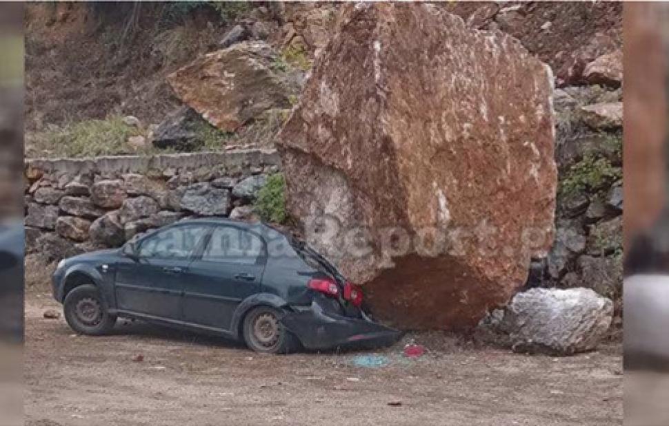 Ένας τεράστιος βράχος έπεσε και καταπλάκωσε σταθμευμένο αυτοκίνητο, όπως φαίνεται και στις φωτογραφίες που δημοσιεύει το lamiareport.gr.
