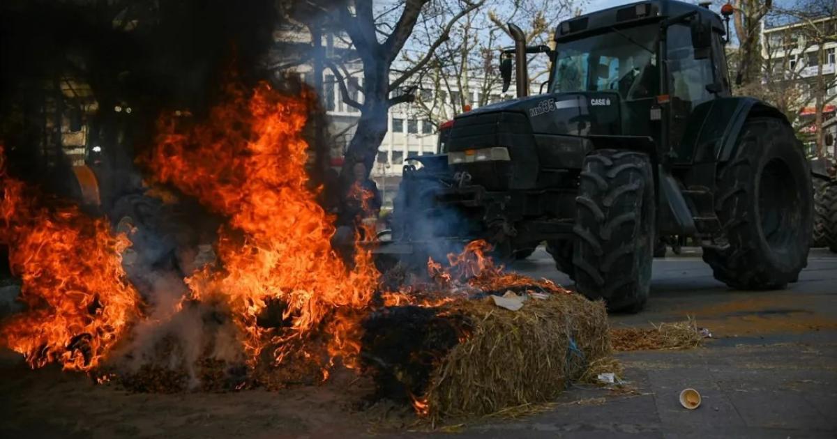 Φωτιά σε λάστιχα και άχυρα έβαλαν συμβολικά το πρωί στην Κεντρική πλατεία της Λάρισας αγρότες από το μπλόκο του Πλατυκάμπου.