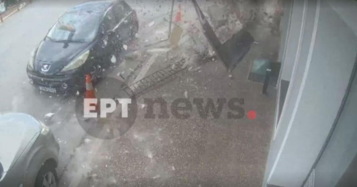 Στο βίντεο που δημοσιεύει η ΕΡΤ, φαίνεται η στιγμή της πτώσης του μπαλκονιού και πώς μία γυναίκα την τελευταία στιγμή μετακινήθηκε και σώθηκε από θαύμα.
