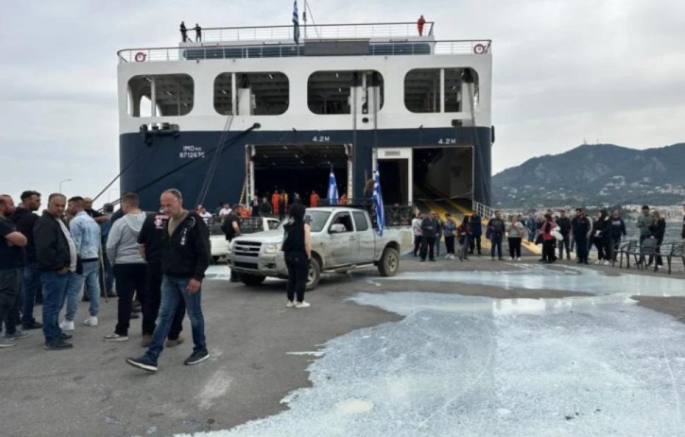 Σύμφωνα με το Stonisi.gr, οι κτηνοτρόφοι προχώρησαν στη ρίψη μεγάλων ποσοτήτων γάλακτος στην άσφαλτο, ακριβώς έξω από τον καταπέλτη του πλοίου «Νήσος Σάμος».
