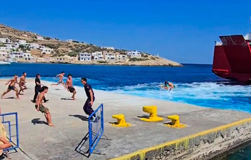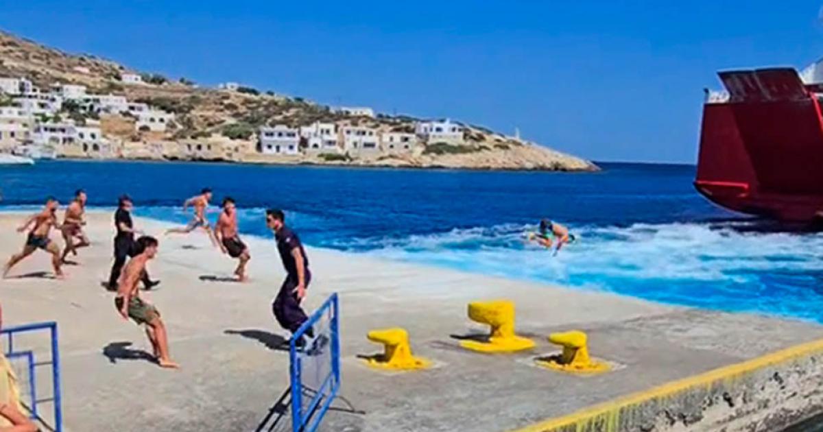 Λίγο μετά την αναχώρηση του πλοίου «Διονύσιος Σολωμός» από το λιμάνι της Σικίνου με προορισμό τον Πειραιά, ως είθισται πλέον στο νησί, το πλοίο κορνάρει παρατεταμένα και ο κόσμος βουτάει στα απόνερά του για το αποχαιρετήσει.