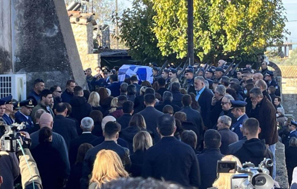 Μετά την ολοκλήρωση της εξοδίου ακολουθίας, η σύζυγος του άτυχου επισμηναγού ακολούθησε συνεντετριμμένη, μαζί με κοντινούς συγγενείς, τη νεκροφόρα που μετέφερε τη σορό στο σημείο της ταφής.