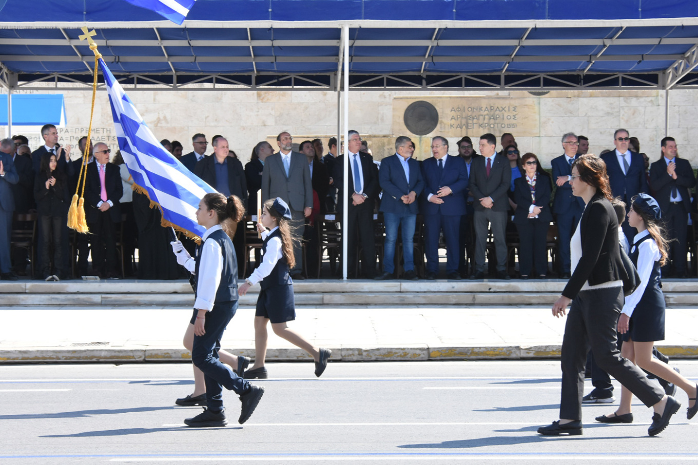 Οι μαθητές παρέλασαν μπροστά από τη Βουλή ενώπιον των επισήμων δεχόμενοι τα χειροκροτήματα όσων βρέθηκαν στην πλατεία Συντάγματος.