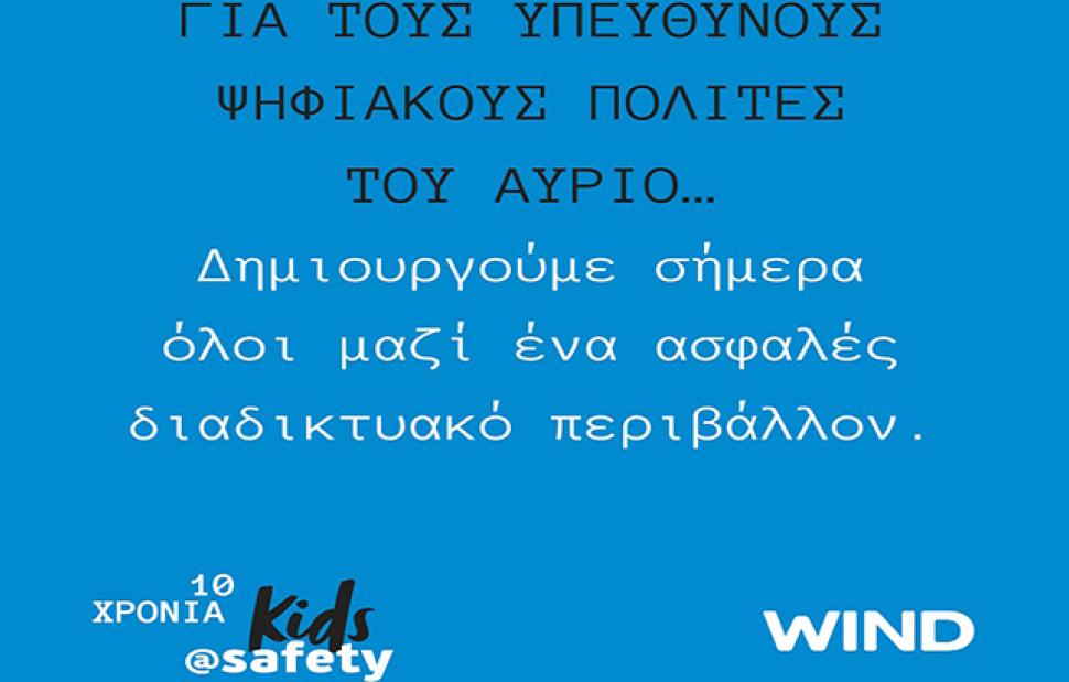 Με ενεργή και αποφασιστική συμμετοχή στην Εθνική Στρατηγική Κυβερνοασφάλειας, η WIND διαδραματίζει από το 2010 τον δικό της καθοριστικό ρόλο στην διαμόρφωση ενός καλύτερου και ασφαλέστερου Διαδικτύου με την ενημερωτική εκστρατεία « Kids@safety, Internet, κινητό και παιδί». Μέσα από συμβουλές για την ορθή χρήση του διαδικτύου, την ενθάρρυνση του διαλόγου μεταξύ ανηλίκων, γονέων, κηδεμόνων και εκπαιδευτικών το πρόγραμμα παράλληλα προωθεί τις θετικές πλευρές των νέων τεχνολογιών και την κριτική σκέψη. Η σχετική ιστοσελίδα του προγράμματος της WIND (www.kidsatsafety.gr) παρέχει χρήσιμες πληροφορίες, ειδήσεις και οπτικοακουστικό υλικό με συμβουλές προς τους γονείς, τα παιδιά και τους εφήβους, έρευνες σχετικά με τη συμπεριφορά των παιδιών στο διαδίκτυο και τη χρήση του, ενώ παραπέμπει και σε ιστοσελίδες ελληνικών οργανισμών που ασχολούνται με την προστασία των παιδιών.