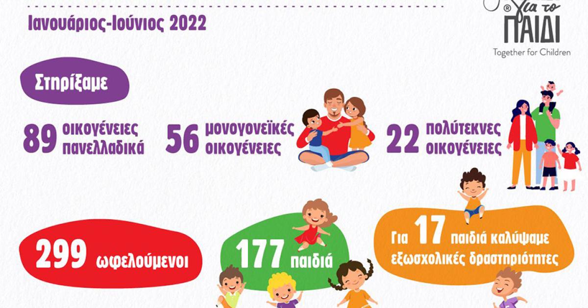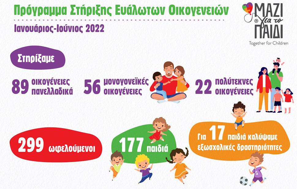Πιο συγκεκριμένα το «Μαζί για το Παιδί» το α’ εξάμηνο του 2022 παρείχε στήριξη σε 177 παιδιά από 89 οικογένειες σε όλη την Ελλάδα που βρίσκονταν στο όριο της φτώχειας. Στόχος του «Μαζί για το Παιδί» είναι να βελτιώσει τις συνθήκες ζωής οικογενειών με ανήλικα παιδιά που βρίσκονται σε οικονομική δυσχέρεια και σε κοινωνικό αποκλεισμό.