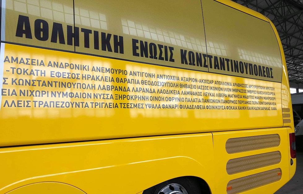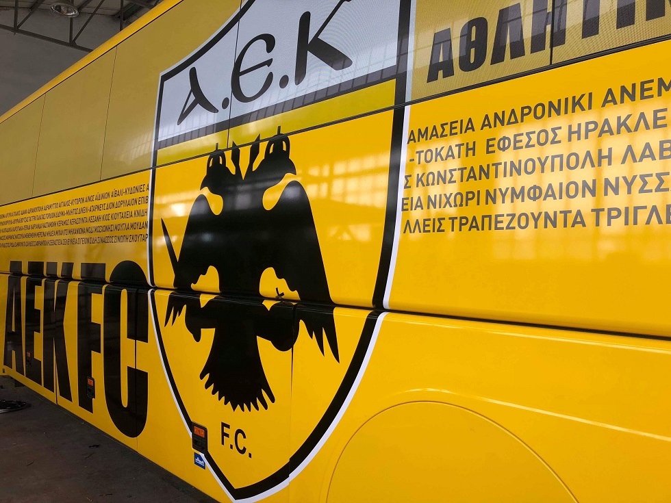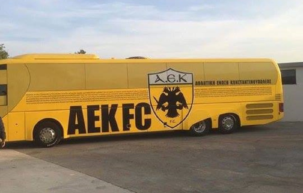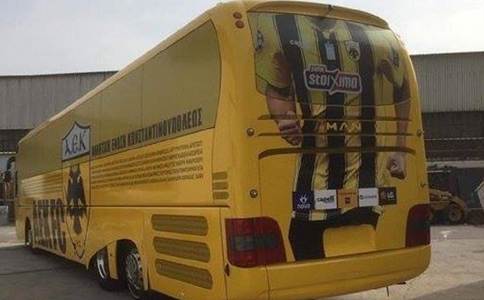 Το πούλμαν είναι κατακίτρινο, η πινακίδα γράφει «ΑΕΚ 1924», ενώ στα πλαϊνά γράφει διάφορες πόλεις του Πόντου.