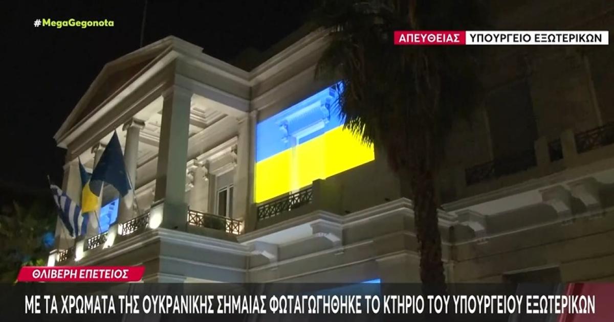 Στα χρώματα της Ουκρανίας φωταγωγήθηκε το υπουργείο Εξωτερικών της χώρας μας. Συγκεκριμένα, στα χρώματα του γαλάζιου και του κίτρινου «ντύθηκε» το υπουργείο Εξωτερικών της χώρας μας με αφορμή τη θλιβερή επέτειο της εισβολής στην Ουκρανία.