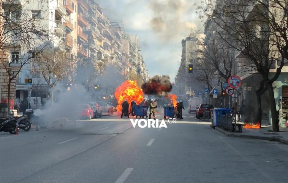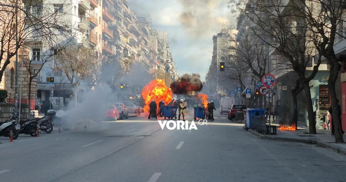 Eπεισόδια ξέσπασαν στη Θεσσαλονίκη την ώρα που ήταν σε εξέλιξη η πορεία για τα τρία χρόνια από τη σιδηροδρομική τραγωδία στα Τέμπη.