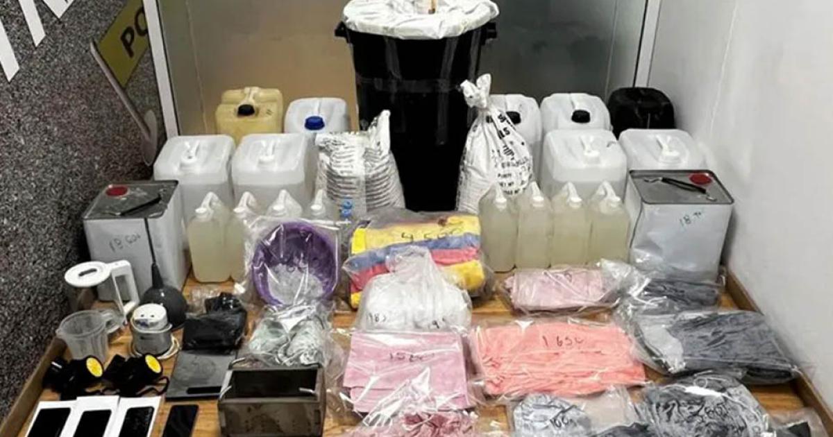 Στο διαμέρισμα-εργαστήριο στο Μενίδι βρέθηκαν και κατασχέθηκαν, μεταξύ άλλων 17,8 κιλά κοκαΐνης εμποτισμένη σε ενδύματα, 255,6 κιλά υγρής ουσίας και 45,5 κιλά λευκής σκόνης, κατάλληλη για νόθευση κοκαΐνης.