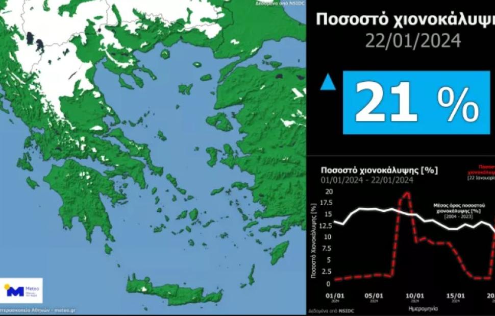 Περίπου το 21% της χερσαίας έκτασης της Ελλάδας καλύπτεται με χιόνι σύμφωνα με το meteo του Εθνικού Αστεροσκοπείου Αθηνών.