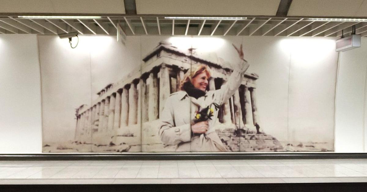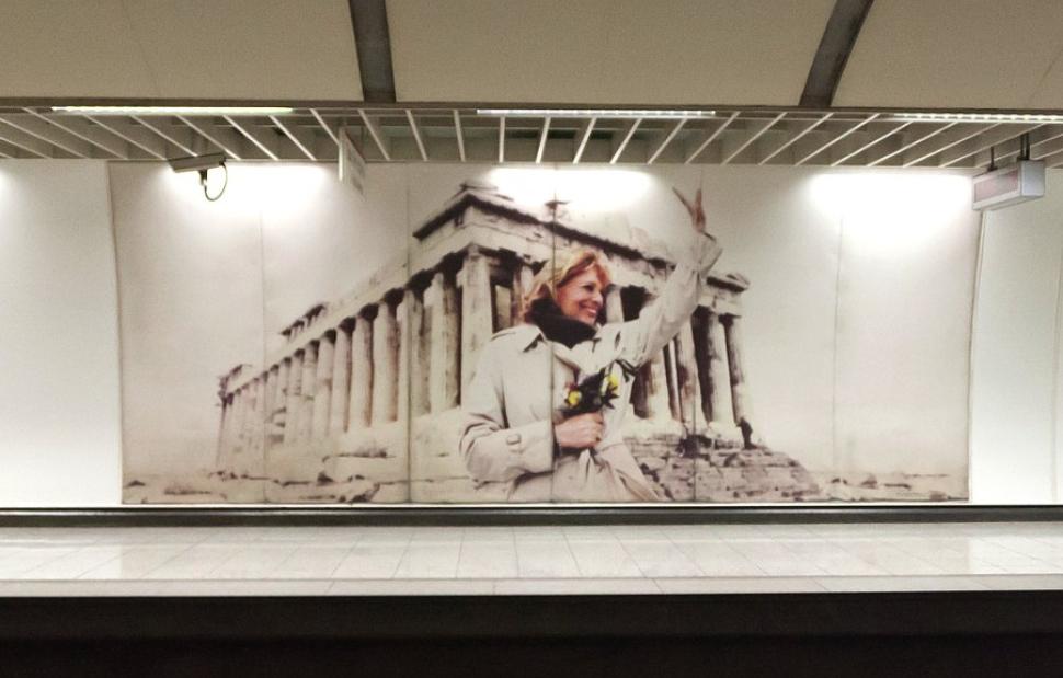 Πρόκειται για την περίφημη φωτογραφία που απεικονίζει υπουργό Πολιτισμού επί κυβερνήσεων Ανδρέα Παπανδρέου και ΠΑΣΟΚ να χαιρετά χαμογελαστή πάνω στον Ιερό Βράχο της Ακρόπολης, κρατώντας ένα μπουκέτο λουλούδια. Η τεράστια αφίσα κοσμεί τον σταθμό του Μετρό, «Ακρόπολη», από την αρχή της δημιουργίας του. Άγνωστοι έχουν αφαιρέσει κομμάτια από διάφορα σημεία της τεράστιας αφίσας.
