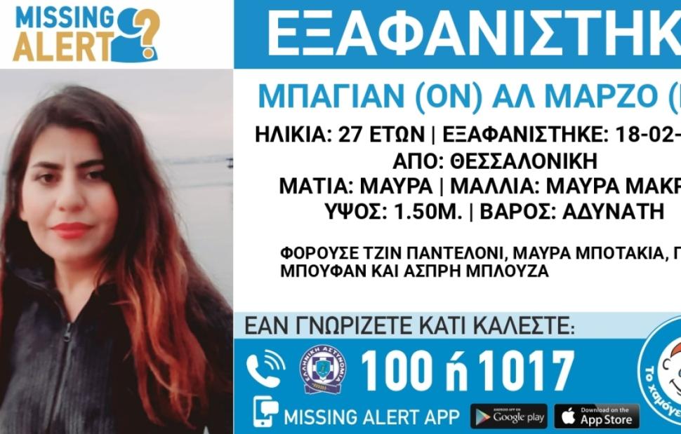 Missing Alert εκδόθηκε για την εξαφάνιση της 27χρονης Μπαγιάν Αλ Μάρζο, που εξαφανίστηκε το μεσημέρι της 18ης Φεβρουαρίου 2024 από τη Θεσσαλονίκη.