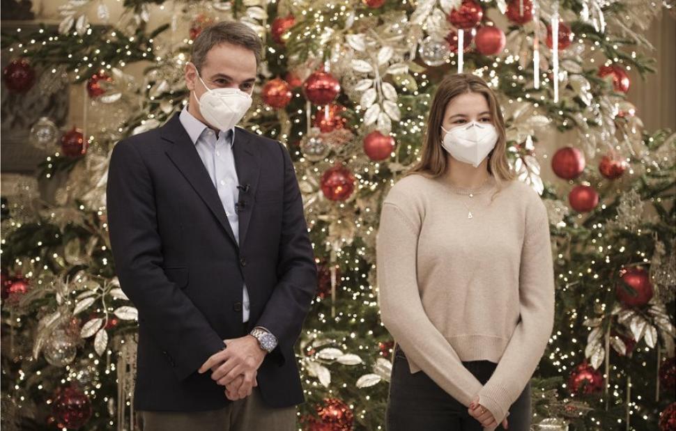 Στη συνέχεια, ο Κυριάκος Μητσοτάκης και η κόρη του, Δάφνη, άκουσαν τα κάλαντα από την Ιφιγένεια, τον Γιώργο και τον Παναγιώτη από τα Άγραφα της Ευρυτανίας.