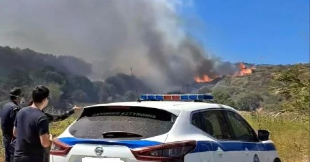 Η φωτιά καίει κοντά σε κατοικημένη περιοχή, όμως έως αυτή τη στιγμή δεν κινδυνεύουν σπίτια, σύμφωνα με την ΕΡΤ.