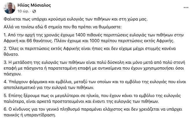 Ο Ηλίας Μόσιαλος με μια ανάρτηση στον λογαριασμό του στο Facebook δίνει περισσότερα στοιχεία για τη νόσο.