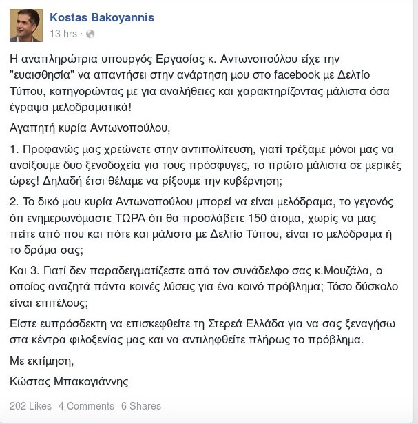 «Η αναπληρώτρια υπουργός Εργασίας κ. Αντωνοπούλου είχε την "ευαισθησία" να απαντήσει στην ανάρτηση μου στο facebook με Δελτίο Τύπου, κατηγορώντας με για αναλήθειες και χαρακτηρίζοντας μάλιστα όσα έγραψα μελοδραματικά!