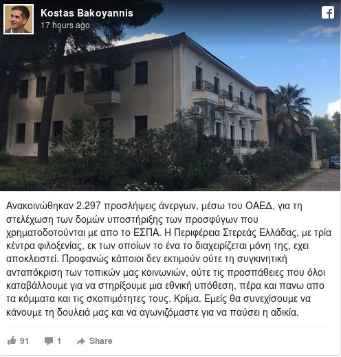 «Ο Περιφερειάρχης Στερεάς Ελλάδας, παρότι υποστηρίζει ότι το προσφυγικό είναι εθνική υπόθεση πάνω από κόμματα και σκοπιμότητες, η δήλωση του αποδεικνύει το αντίθετο, ακολουθώντας πιστά την αντιπολιτευτική γραμμή της ΝΔ που συνδυάζει το μελόδραμα και την παραπληροφόρηση», αναφέρεται, μεταξύ άλλων στο δελτίο Τύπου.