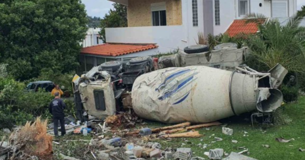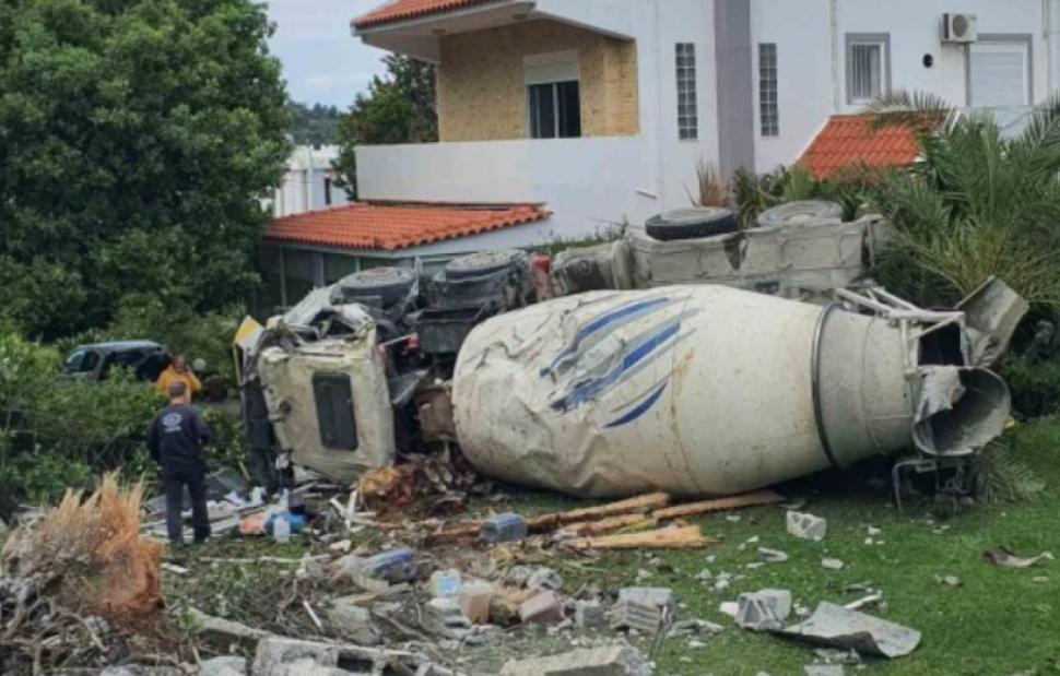 Μπετονιέρα φορτωμένη με σκυρόδεμα κατέληξε στην αυλή σπιτιού στην Ιξιά στη Ρόδο. Ο οδηγός της μπετονιέρα τραυματίστηκε ελαφρά και βγήκε μόνος του από το όχημα.