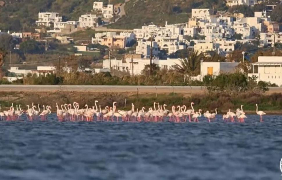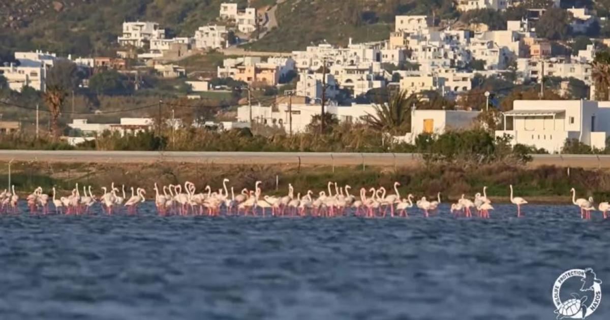 Ένα μοναδικό θέαμα αντίκρισαν οι περαστικοί στη λιμνοθάλασσα της Αλυκής Νάξου όταν ένα σμήνος 160 φλαμίνγκο σταμάτησε στον υγρότοπο για ανεφοδιασμό.