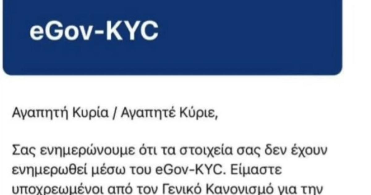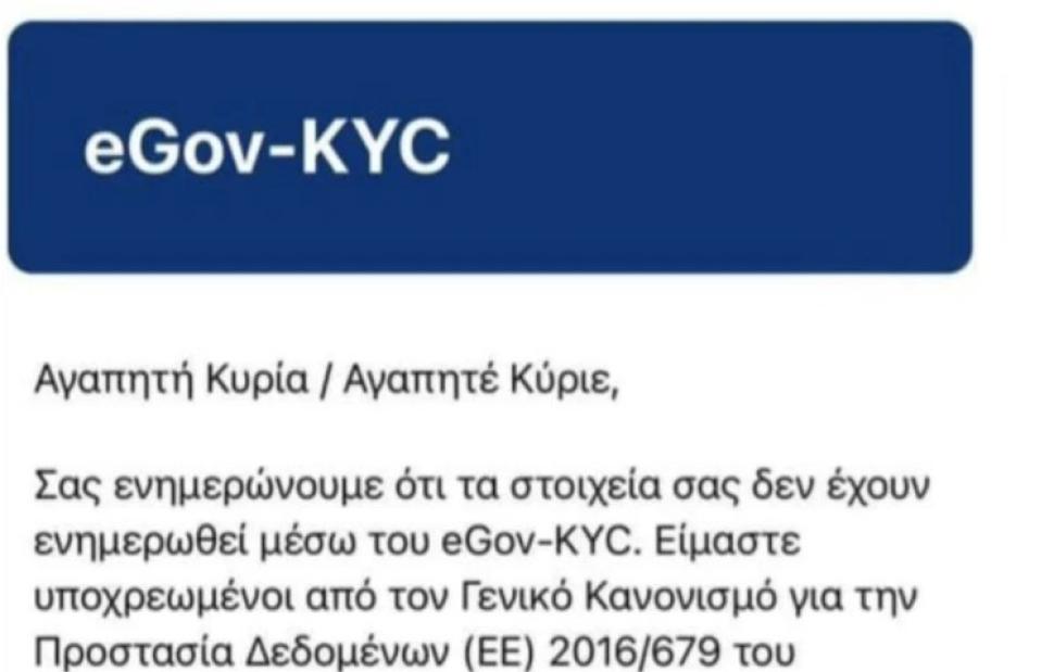 Tο ψευδές αυτό e-mail προσομοιώνει αίτημα από την υπηρεσία eGov- KYC, ζητώντας στοιχεία επικοινωνίας από τον πολίτη.