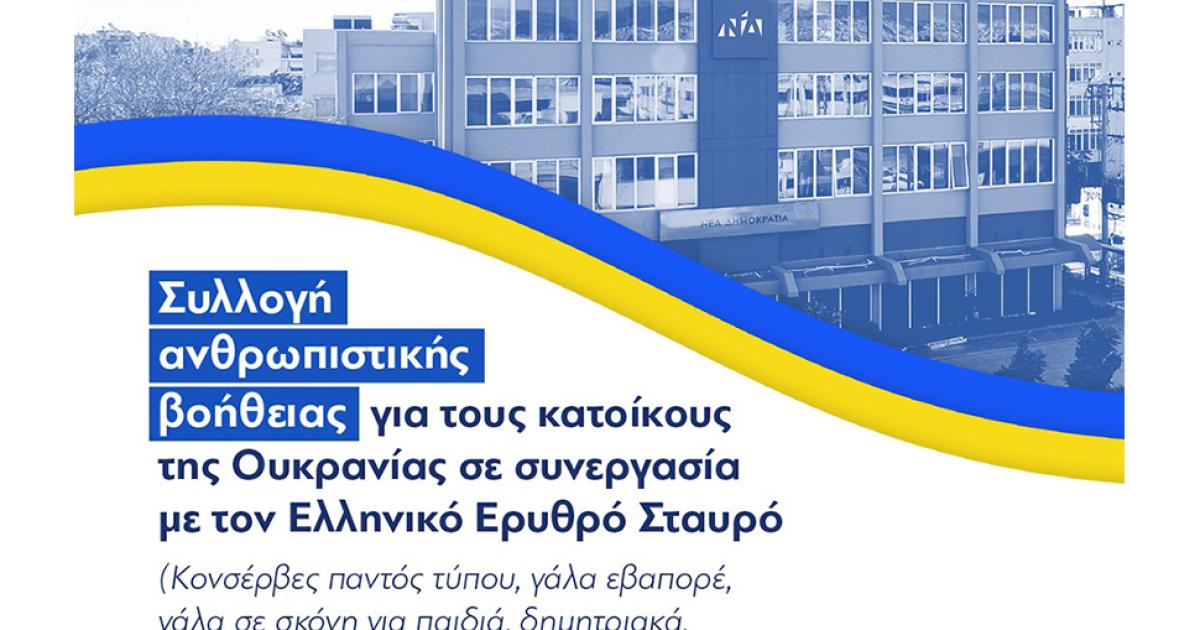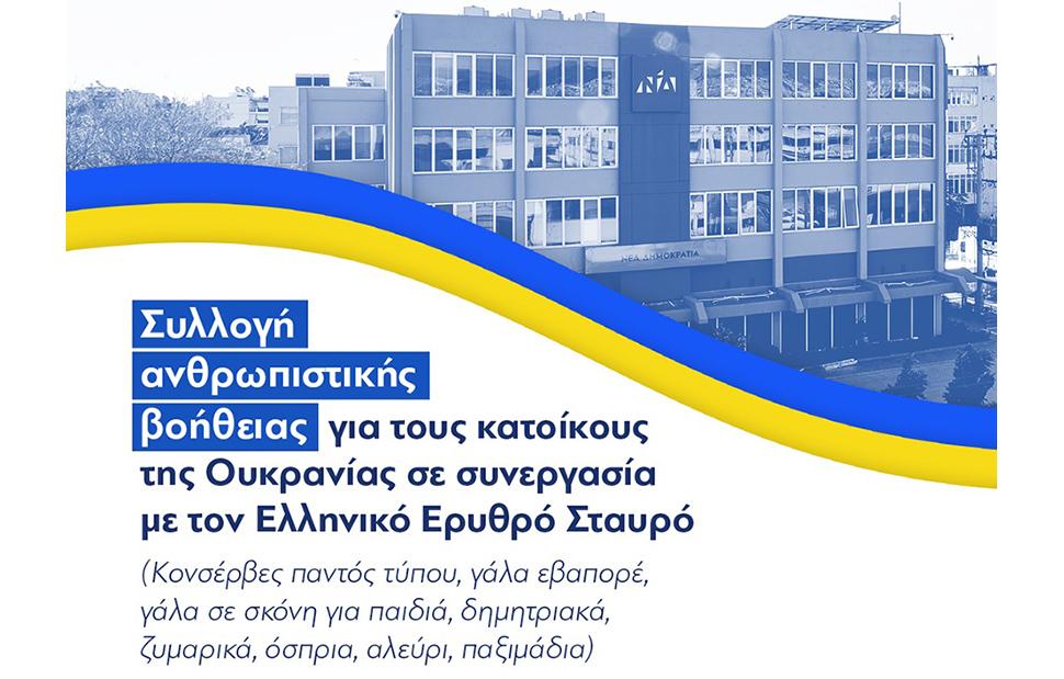 Σε ένδειξη αλληλεγγύης προς τον δοκιμαζόμενο ουκρανικό λαό, η Νέα Δημοκρατία, σε συνεργασία με τον Ελληνικό Ερυθρό Σταυρό, συγκεντρώνει είδη πρώτης ανάγκης, προκειμένου να αποστείλει ανθρωπιστική βοήθεια στην Ουκρανία και καλεί τα μέλη της, αλλά και κάθε πολίτη που θέλει να ενισχύσει αυτή την προσπάθεια.