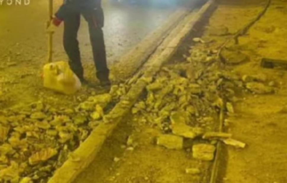 Συνεργεία του δήμου απομακρύνουν τα οικοδομικά υλικά από τον δρόμο.