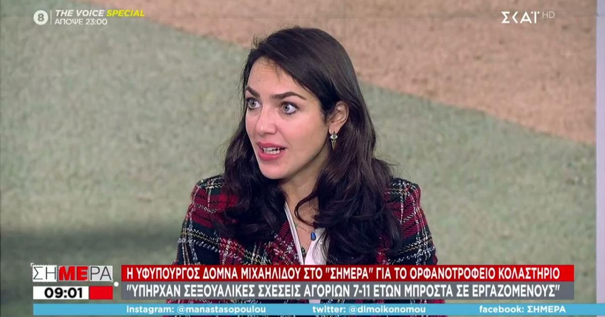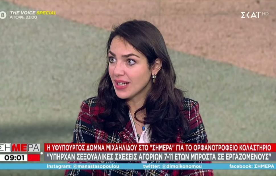 Η υφυπουργός Εργασίας, Δόμνα Μιχαηλίδου, προέβη σε νέες αποκαλύψεις για τις σεξουαλικές κακοποιήσεις σε αγόρια 7 με 11 ετών, παρουσία εργαζομένων, σε ορφανοτροφείο της Αττικής.
