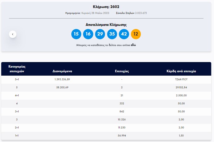 Οι αριθμοί που κληρώθηκαν είναι οι 15, 16, 29, 35, 42 και τζόκερ ο 12.