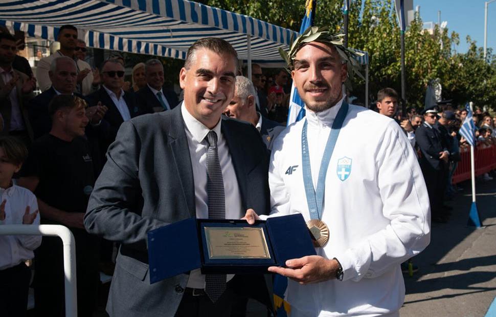Ο Αντώνης Παπακωνσταντίνου, ο οποίος κατέκτησε το χάλκινο Ολυμπιακό μετάλλιο στο Διπλό Σκιφ Ελαφριών Βαρών στους Ολυμπιακούς Αγώνες του Παρισιού 2024, το περασμένο καλοκαίρι, σταμάτησε μπροστά στο βάθρο των επισήμων, όπου ο Δήμαρχος Ελληνικού Αργυρούπολης Γιάννης Κωνσταντάτος τον τίμησε εκ μέρους όλων των πολιτών.