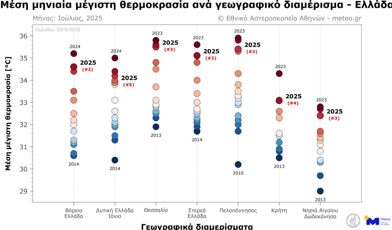 Στη Βόρεια και τη Στερεά Ελλάδα, ο Ιούλιος 2025 ήταν ο 2ος θερμότερος από το 2010, στη Θεσσαλία, στην Πελοπόννησο και στα Νησιά Αιγαίου και Δωδεκάνησα ο 3ος θερμότερος, ενώ στην Κρήτη και στη Δυτική Ελλάδα και Ιόνιο ο 4ος και ο 5ος θερμότερος, αντίστοιχα, από το 2010.