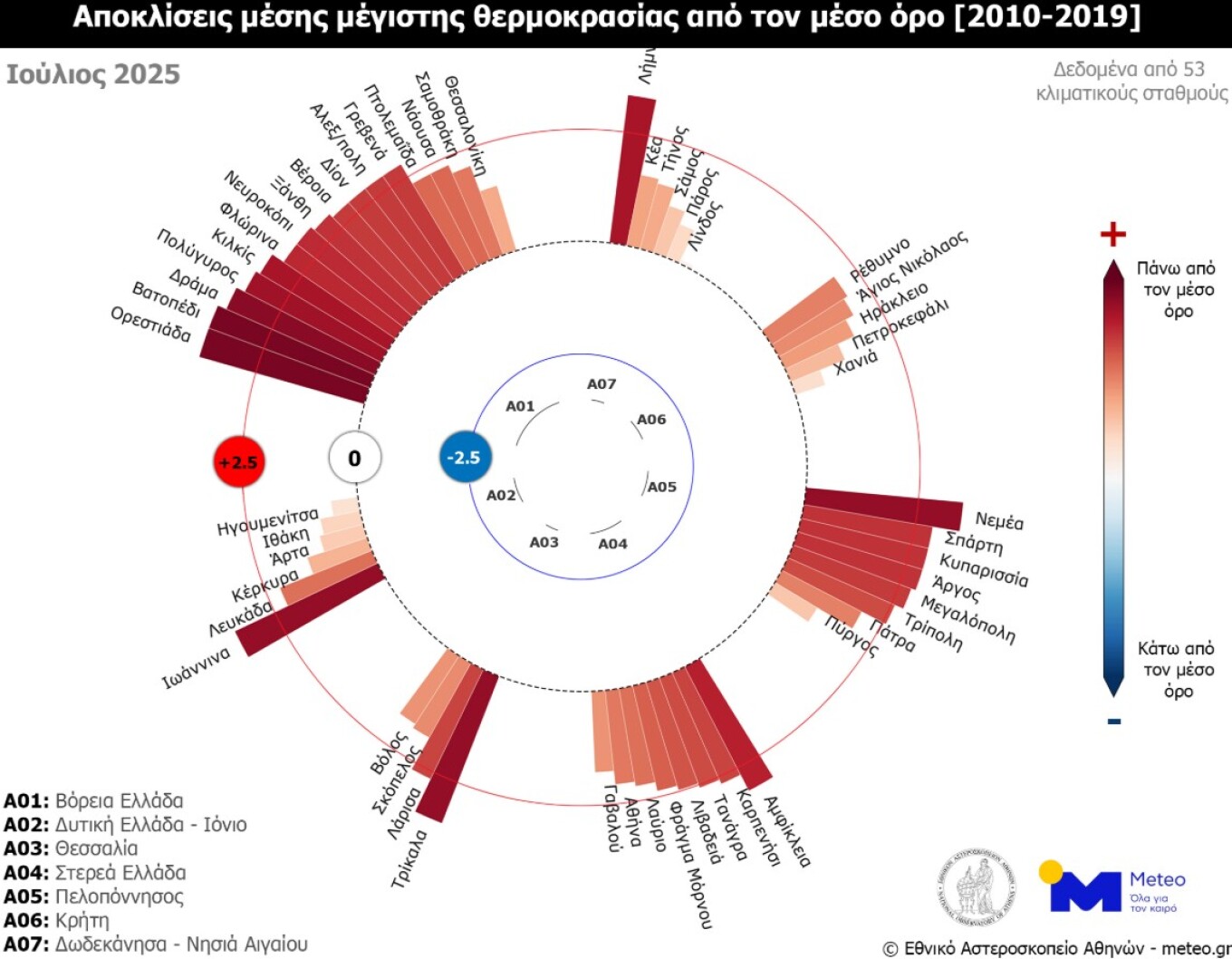 Σύμφωνα με το δίκτυο των 53 μετεωρολογικών σταθμών του meteo.gr του Εθνικού Αστεροσκοπείου Αθηνών (ΕΑΑ) που λειτουργούν από το 2010 μέχρι σήμερα, τον Ιούλιο του 2025 η μέση τιμή των μεγίστων ημερήσιων θερμοκρασιών κυμάνθηκε πάνω από τα κανονικά για την εποχή επίπεδα σε όλες τις περιοχές της χώρας (σε σχέση με τον μέσο όρο της περιόδου 2010-2019).