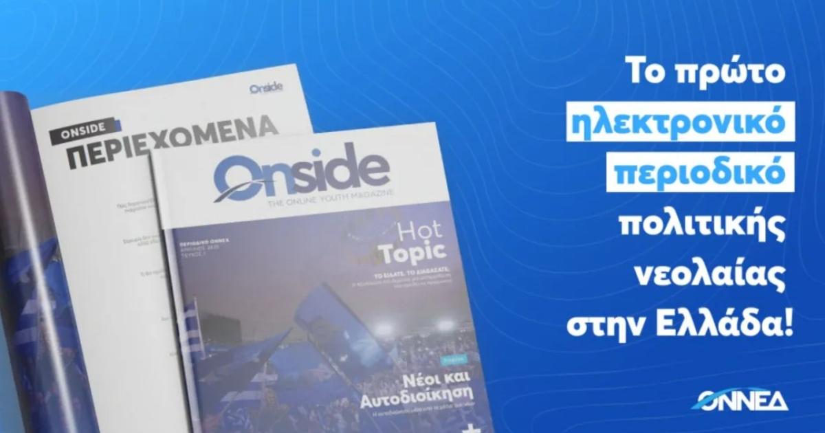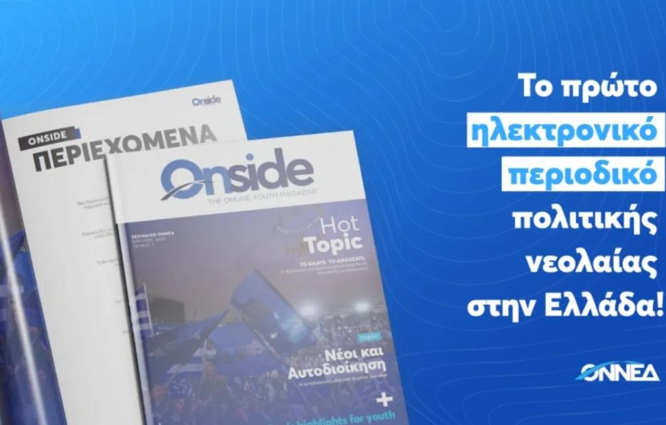 Tο «Onside Magazine», το πρώτο ηλεκτρονικό περιοδικό πολιτικής νεολαίας στην Ελλάδα εγκαινιάζει η ΟΝΝΕΔ. Το περιοδικό φιλοδοξεί να αποτελέσει έναν φρέσκο και σύγχρονο χώρο όπου οι νέοι της χώρας θα μπορούν να ενημερώνονται για τα πολιτικά θέματα που τους αφορούν, ενώ παράλληλα θα έχουν τη δυνατότητα να συμμετέχουν ενεργά στη συζήτηση για τις πολιτικές εξελίξεις.