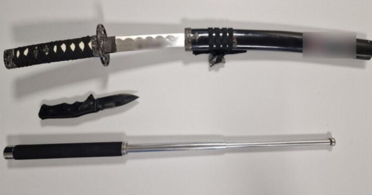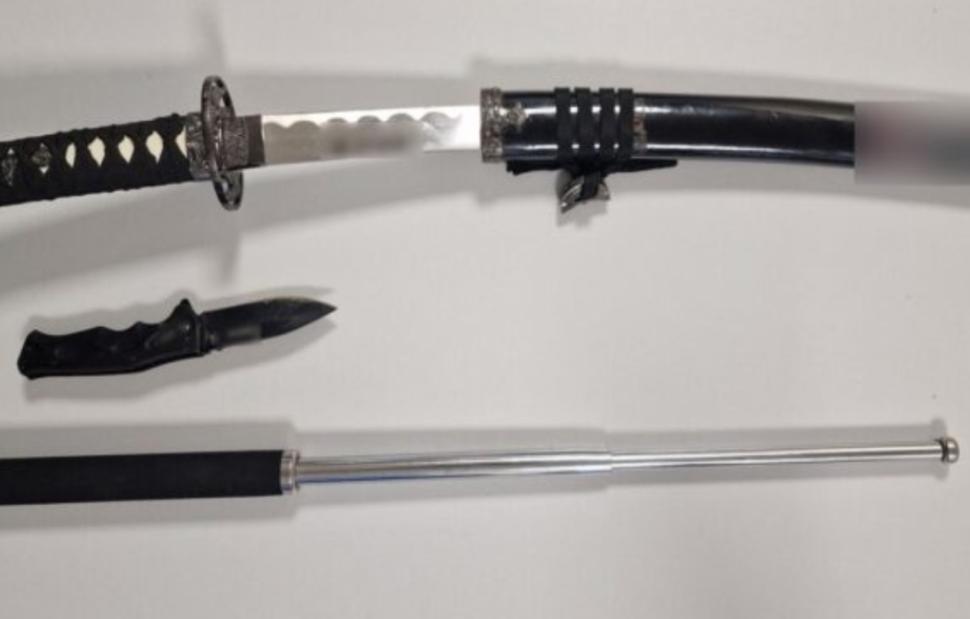 Κατά την έρευνα κατασχέθηκαν μία πτυσσόμενη μεταλλική ράβδος, ένα σπαθί τύπου σαμουράι με τη θήκη του και ένας αναδιπλούμενος σουγιάς.