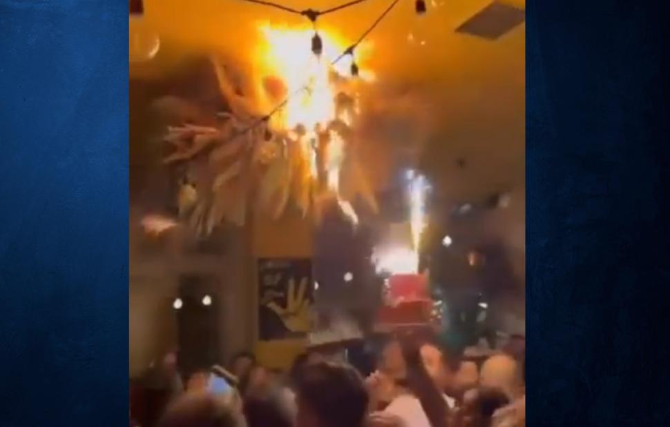 Όλα έγιναν όταν ο σερβιτόρος που συνελήφθη από τις αρχές, μετέφερε την τούρτα σε μία παρέα, με αποτέλεσμα το ένα από τα βεγγαλικά να προκαλέσει τη φωτιά στον στολισμό που υπήρχε στην οροφή του μπαρ.