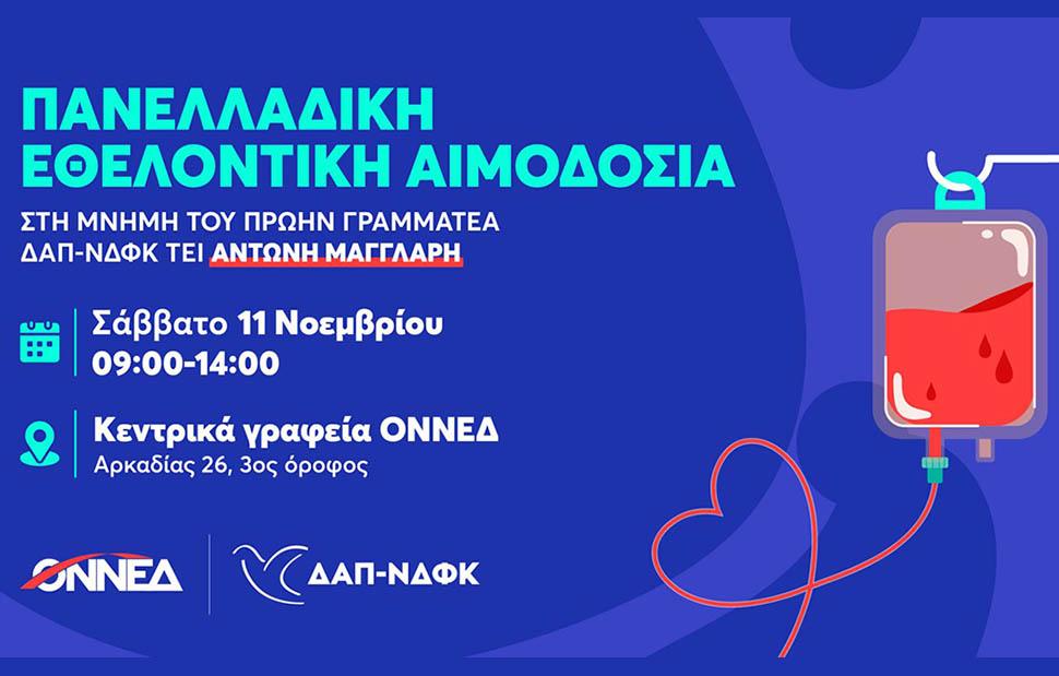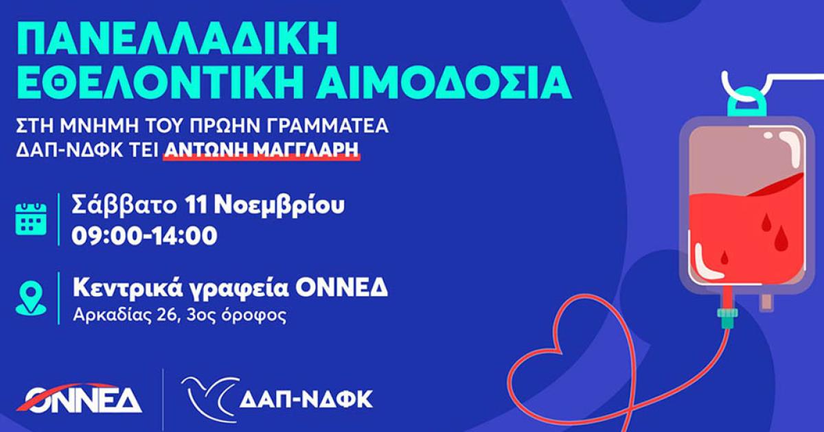 Στο πλαίσιο των τακτικών δράσεων αιμοδοσίας που πραγματοποιούν η ΟΝΝΕΔ και η ΔΑΠ-ΝΔΦΚ, διοργανώνουν το Σάββατο 11 Νοεμβρίου και ώρα 09:00-14:00, στα Κεντρικά γραφεία της ΟΝΝΕΔ (Αρκαδίας 26, 3ος όροφος) εθελοντική αιμοδοσία στη μνήμη του πρώην Γραμματέα ΔΑΠ-ΝΔΦΚ ΤΕΙ Αντώνη Μαγγλάρη για την ενίσχυση των αποθεμάτων αίματος.