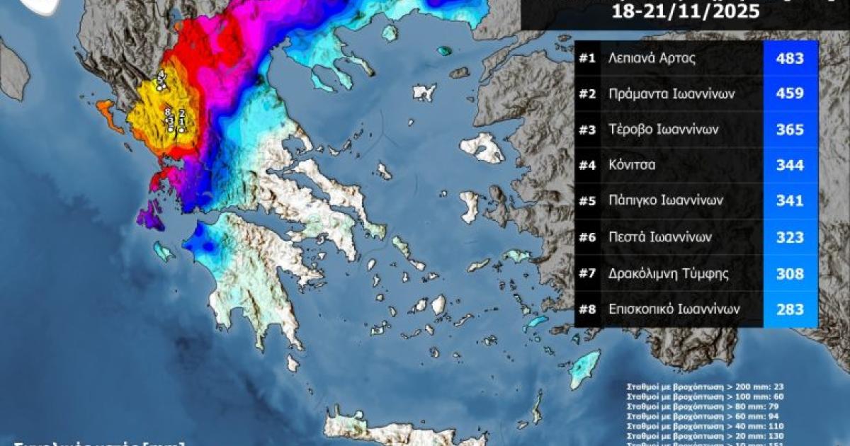 Πάνω από 400 χιλιοστά βροχής καταγράφηκαν στα ορεινά της Ηπείρου σύμφωνα με το meteo.gr/ Εθνικό Αστεροσκοπείο Αθηνών. Όπως επισημαίνεται, πολύ έντονες και επίμονες βροχοπτώσεις επηρέασαν μεγάλο τμήμα της Δυτικής και Βορειοδυτικής Ελλάδας κατά το τετραήμερο 18 – 21 Νοεμβρίου 2025, με αποτέλεσμα να σημειωθούν εξαιρετικά υψηλά αθροιστικά ύψη υετού, κυρίως στην Ήπειρο.