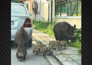 Μια οικογένεια... ασυνήθιστων περιπατητών εμφανίστηκαν στους Θρακομακεδόνες, καθώς δύο μεγάλα αγριογούρουνα και τα μικρά τους εμφανίστηκαν να περιδιαβαίνουν τους δρόμους της περιοχ...
