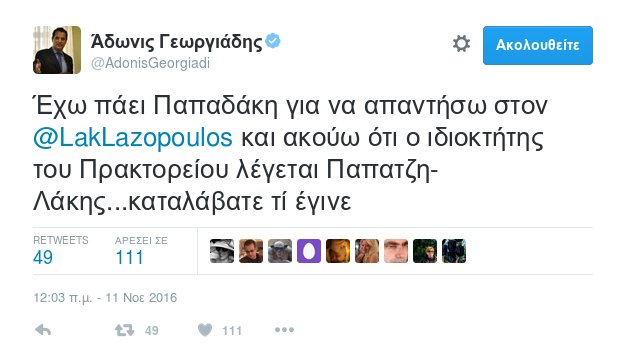 Υπενθυμίζεται πως το πρωί της Πέμπτης, ο Άδωνις Γεωργιάδης είχε προαναγγείλει στους διαδικτυακούς του φίλους στο Twitter, ότι θα βρεθεί στην εκπομπή του Γ. Παπαδάκη στον ΑΝΤ1 για να σχολιάσει τις χθεσινές δηλώσεις Λαζόπουλου στην ίδια εκπομπή.