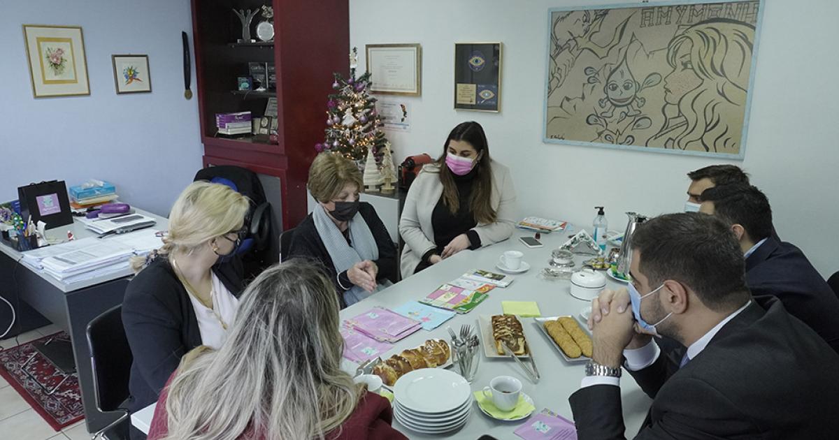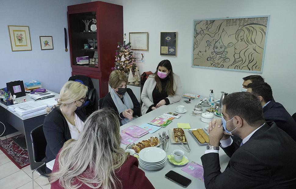 Ο Αντιπρόεδρος Κώστας Μαμουλής, η Γραμματέας της ΔΑΠ-ΝΔΦΚ Κατερίνα Κορωνιά, ο Γραμματέας Οργανωτικού Ορφέας Γεωργίου, η Διευθύντρια του Γραφείου Τύπου Κωνσταντίνα Κόλλια και η Υπεύθυνη Οικογενειακής Πολιτικής και Ισότητας των Φύλων Κατερίνα Καραβιώτη ξεναγήθηκαν στις εγκαταστάσεις και τα εργαστήρια του Συλλόγου από την Πρόεδρο του Συλλόγου Βούλα Μπέλου, την κοινωνική λειτουργό Διονυσία Βασιλάρα και την Ψυχολόγο Λεμονιά Αηδονίδου.