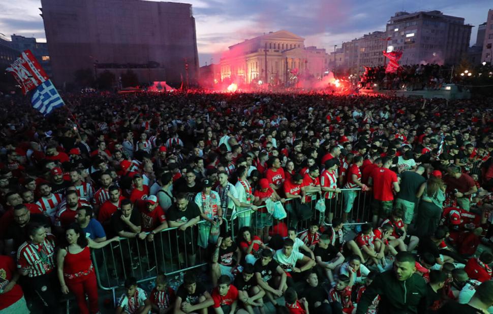 Γιγαντοοθόνες στήθηκαν σε σημεία στον Πειραιά όπου χιλιάδες φίλαθλοι του Ολυμπιακού παρακολούθησαν τον τελικό του Conference League κόντρα στη Φιορεντίνα.