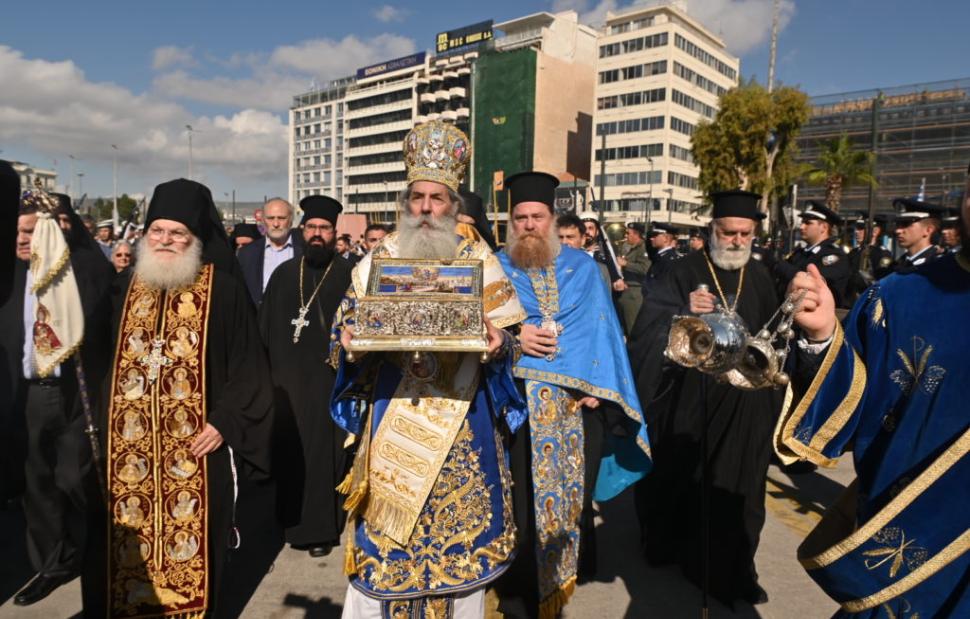 Με τιμές αρχηγού κράτους και κάθε λαμπρότητα υποδέχθηκε ο Πειραιάς το Σάββατο την Αγία Ζώνη της Παναγίας, το μοναδικό θεομητορικό κειμήλιο από την επίγεια ζωή της, το οποίο φυλάσσεται στην Μονή Βατοπαιδίου.