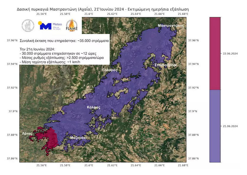 Περισσότερα από 30.000 στρέμματα επηρεάστηκαν μέσα σε 12 ώρες, από την ώρα εκδήλωση της πυρκαγιάς (21.06.2024, ~15:00) έως και τα μεσάνυχτα της ίδιας ημέρας (21.06.2024, 23:59).