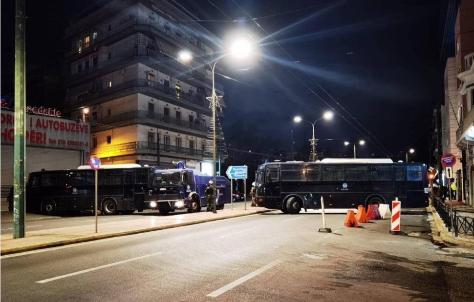 Οι κουκουλοφόροι πέταξαν πέτρες και οι δυνάμεις των ΜΑΤ τους απώθησαν με κρότου λάμψης και χρήση χημικών. Στη συνέχεια, αφού έβαλαν φωτιές σε δύο κάδους, μέσω της οδού Μάρνη, έφυγαν με κατεύθυνση τα Εξάρχεια.